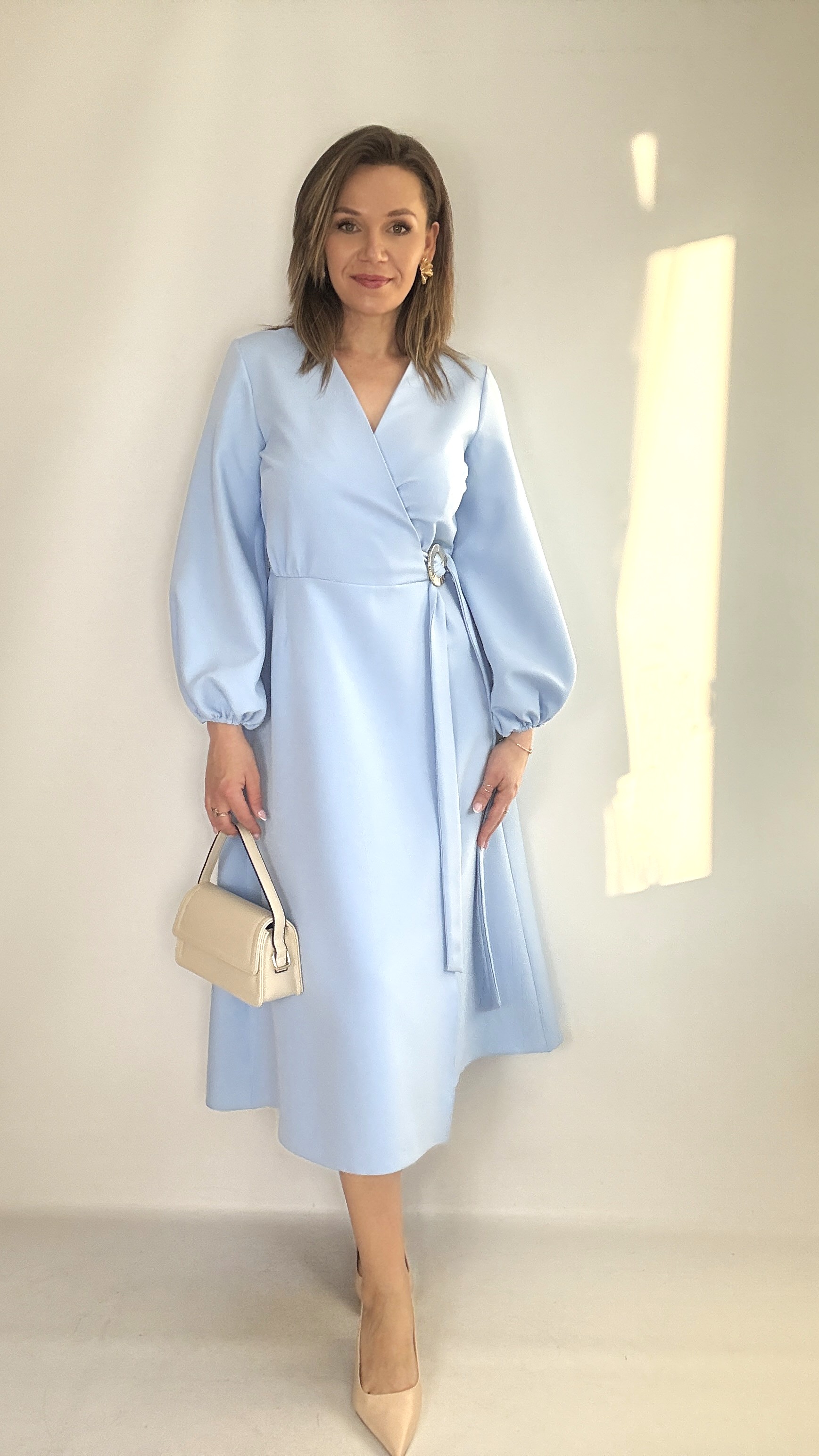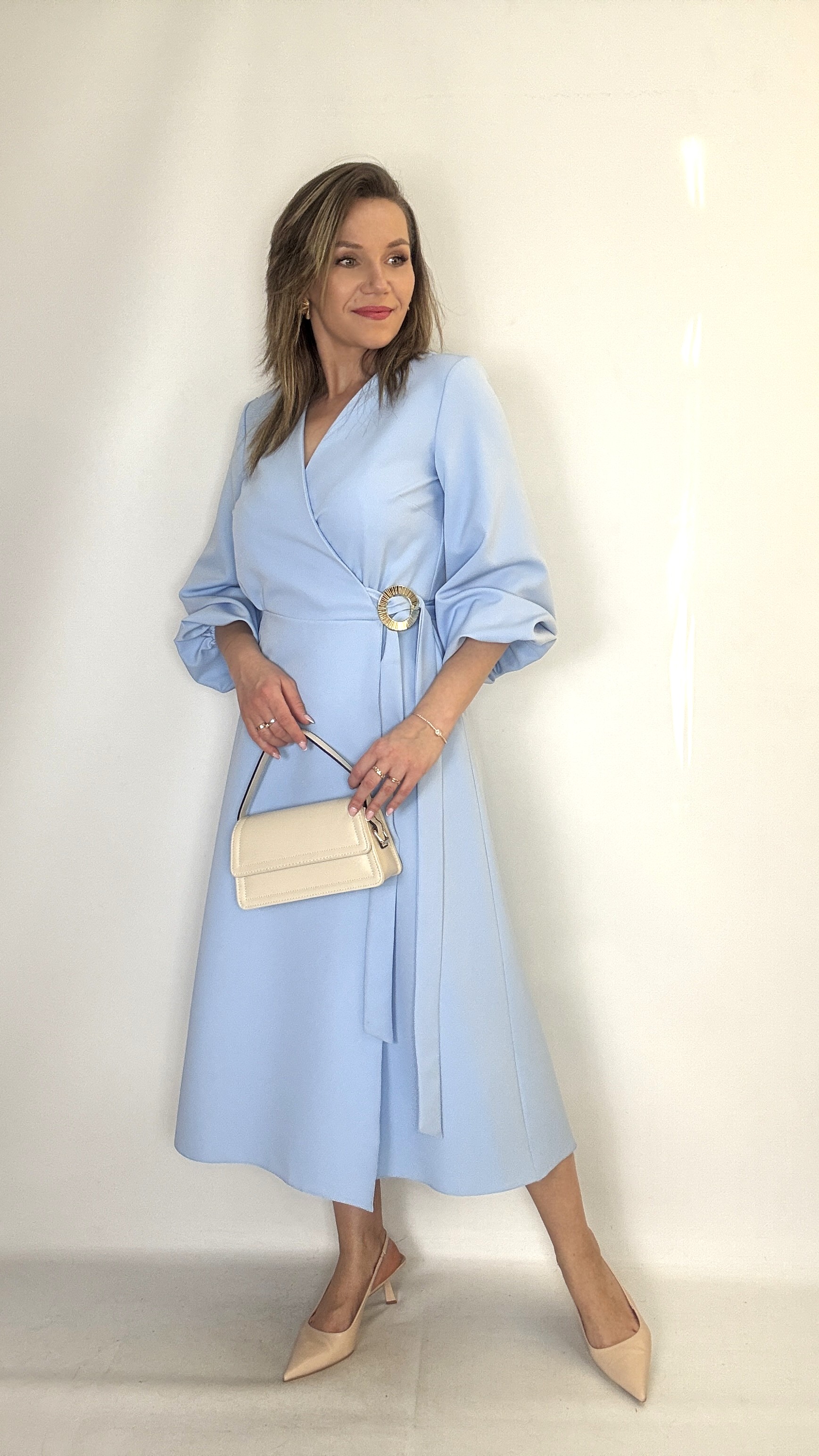 Elegancka Sukienka midi kopertowa z wiązaniem błękit