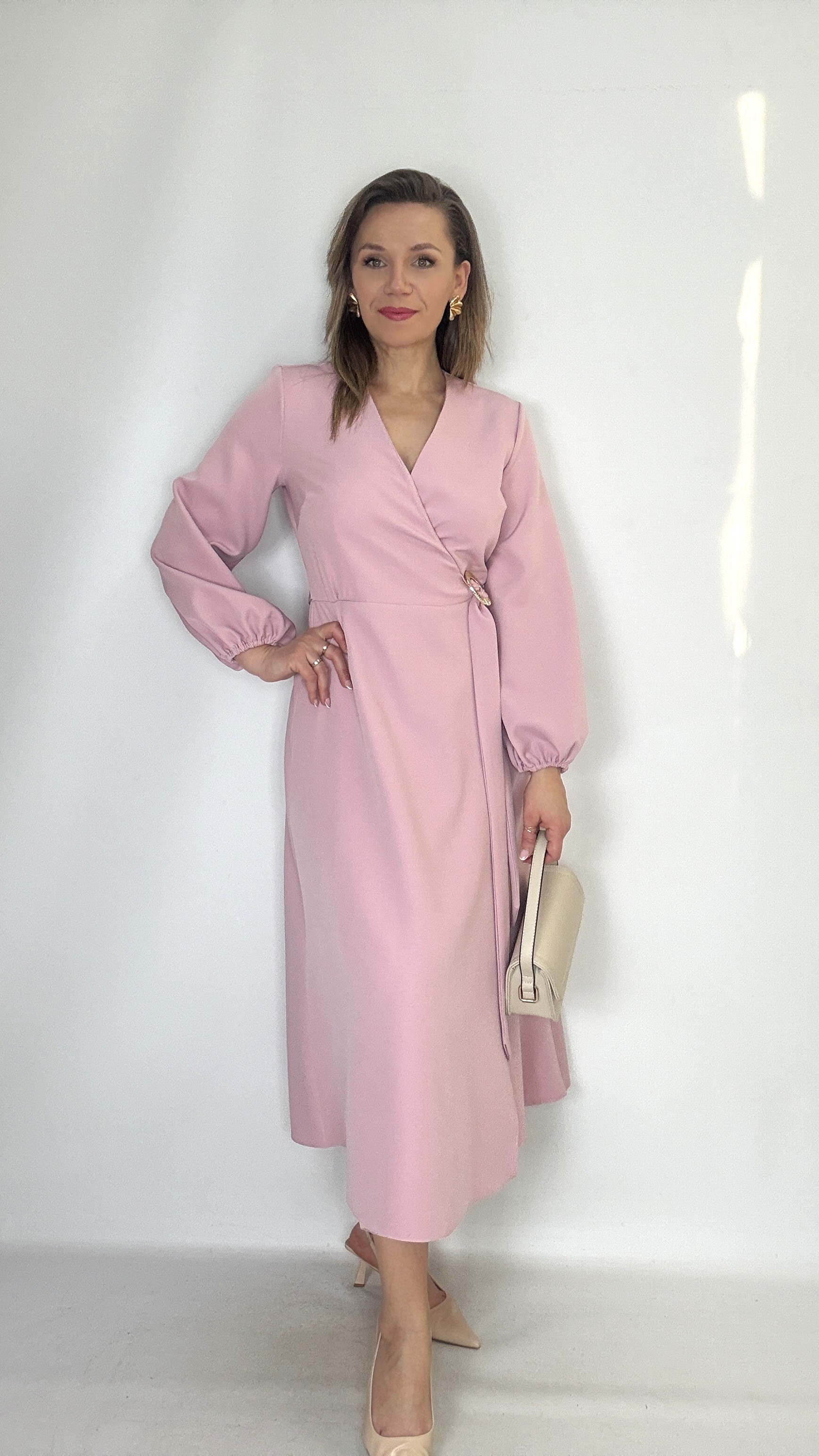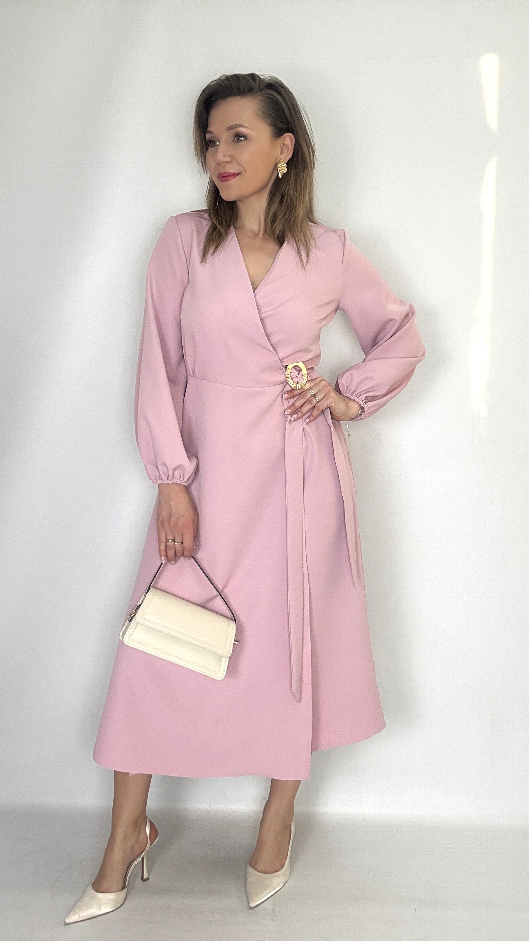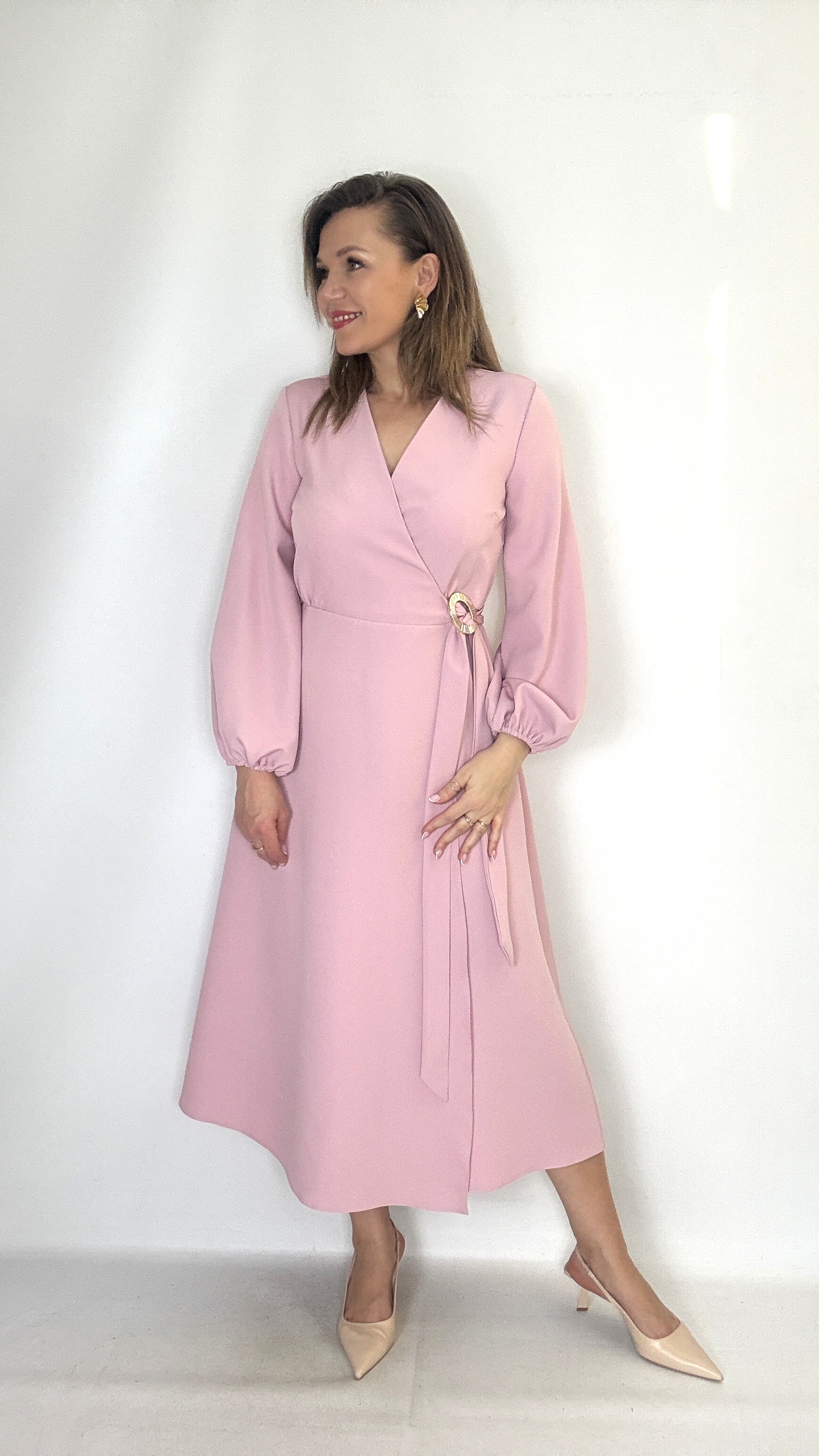 Elegancka Sukienka midi kopertowa z wiązaniem puder róż