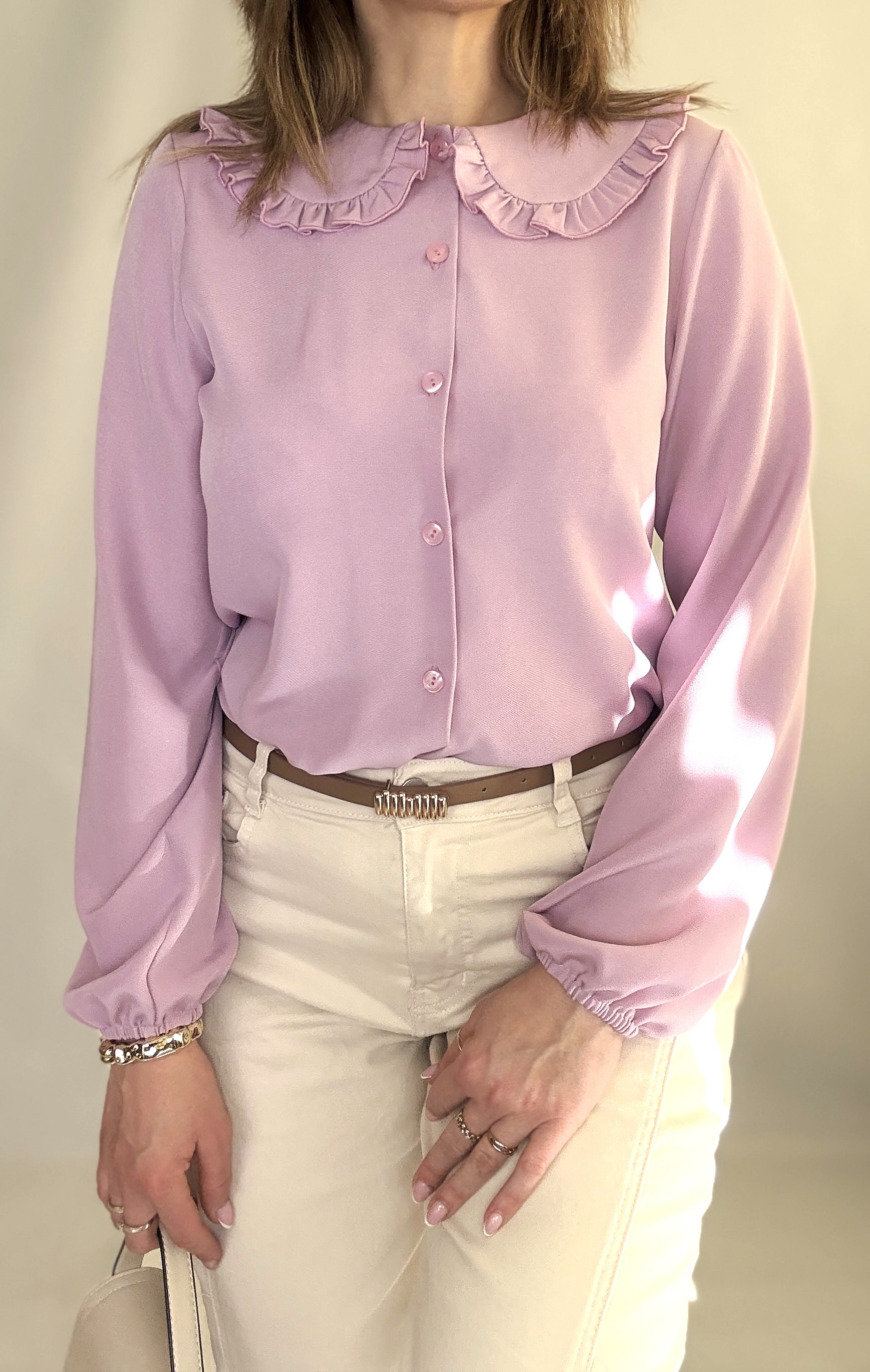 Elegancka koszula o luźnym kroju z ozdobnym kołnierzykiem. Klasyczny model idealny do eleganckiej spódnicy i spodni, jak i jeansów. Koszula zdobiona kołnierzykiem wykończony falbanką co nadaję jej dziewczęcego uroku.