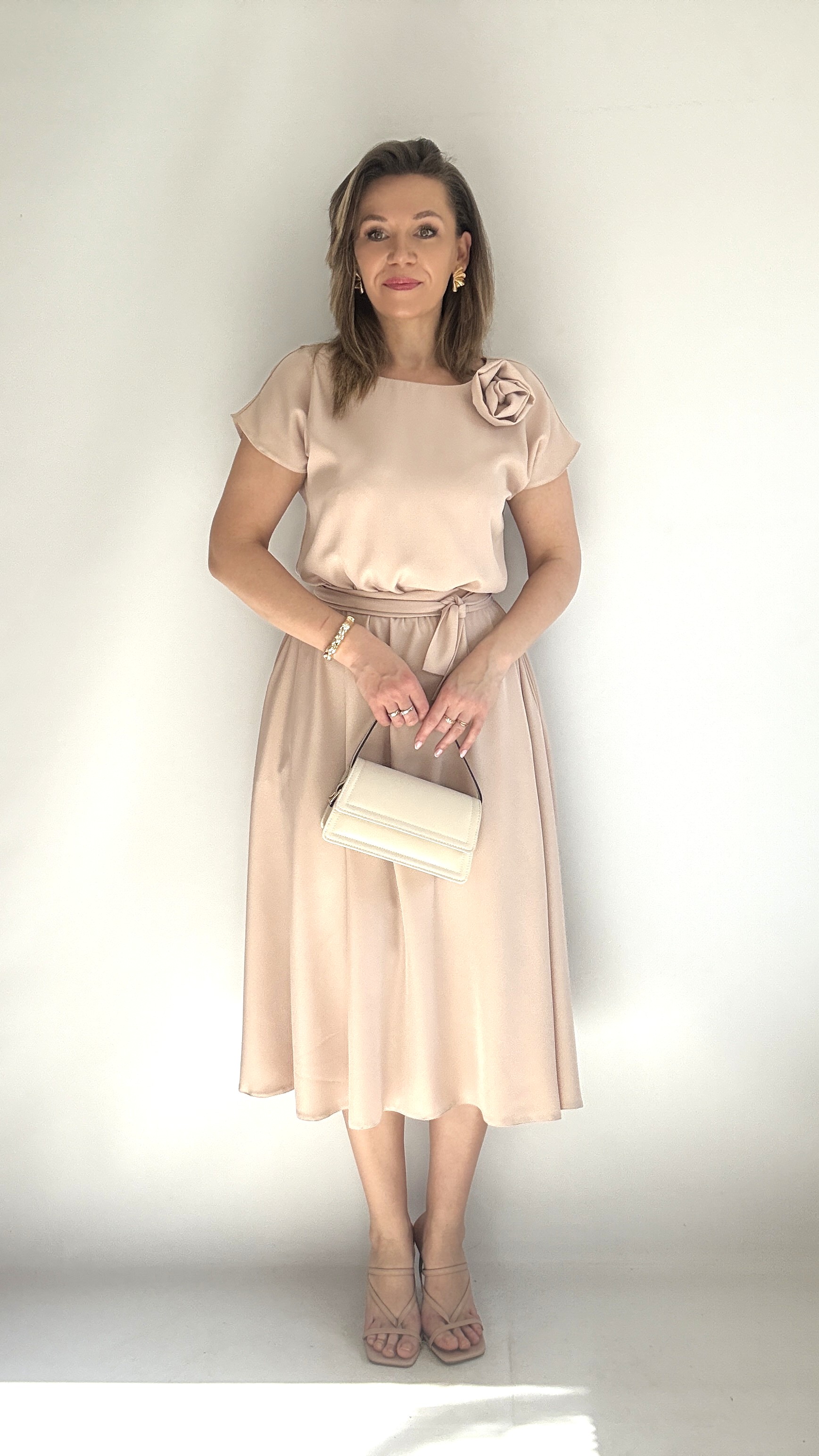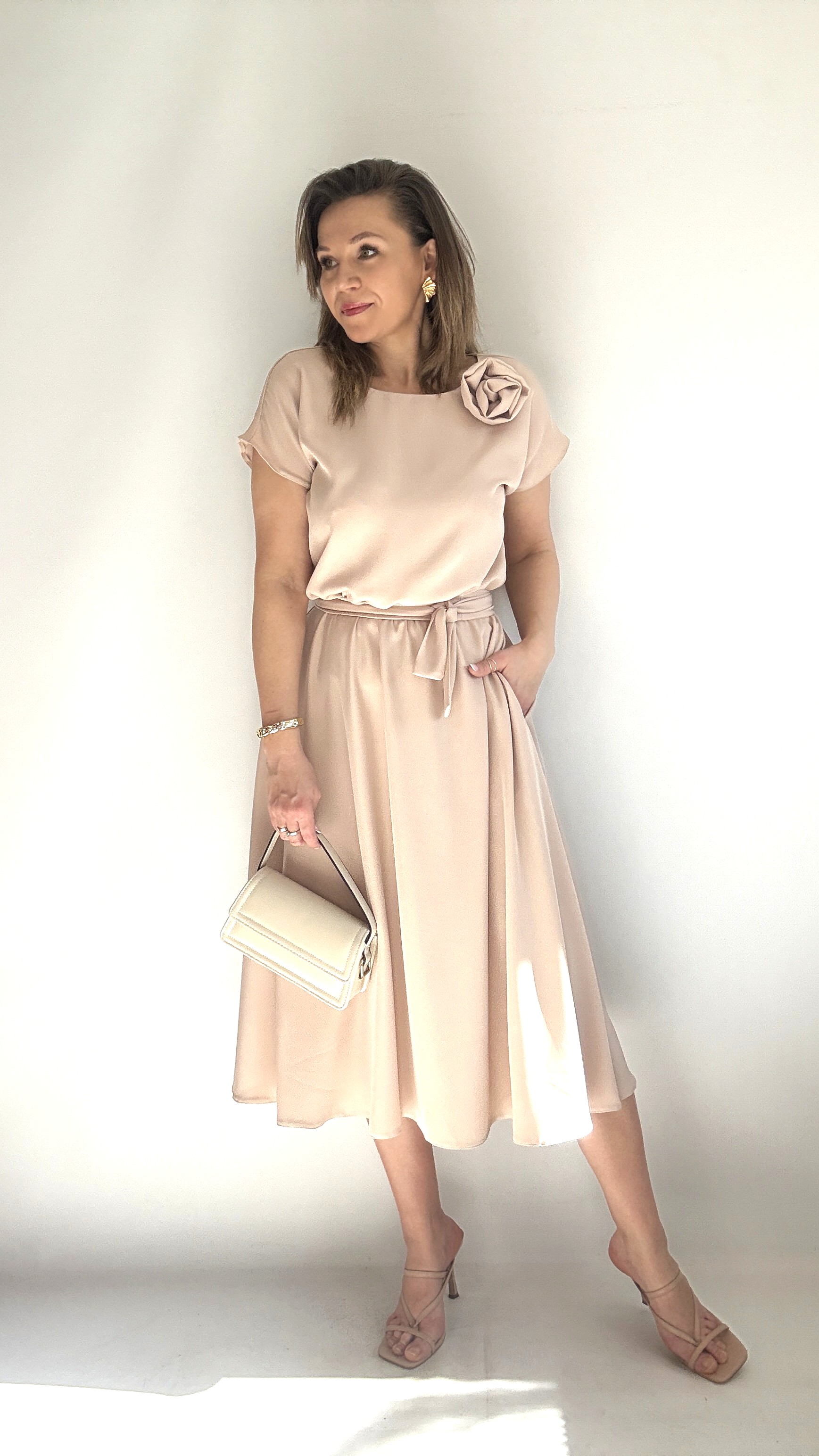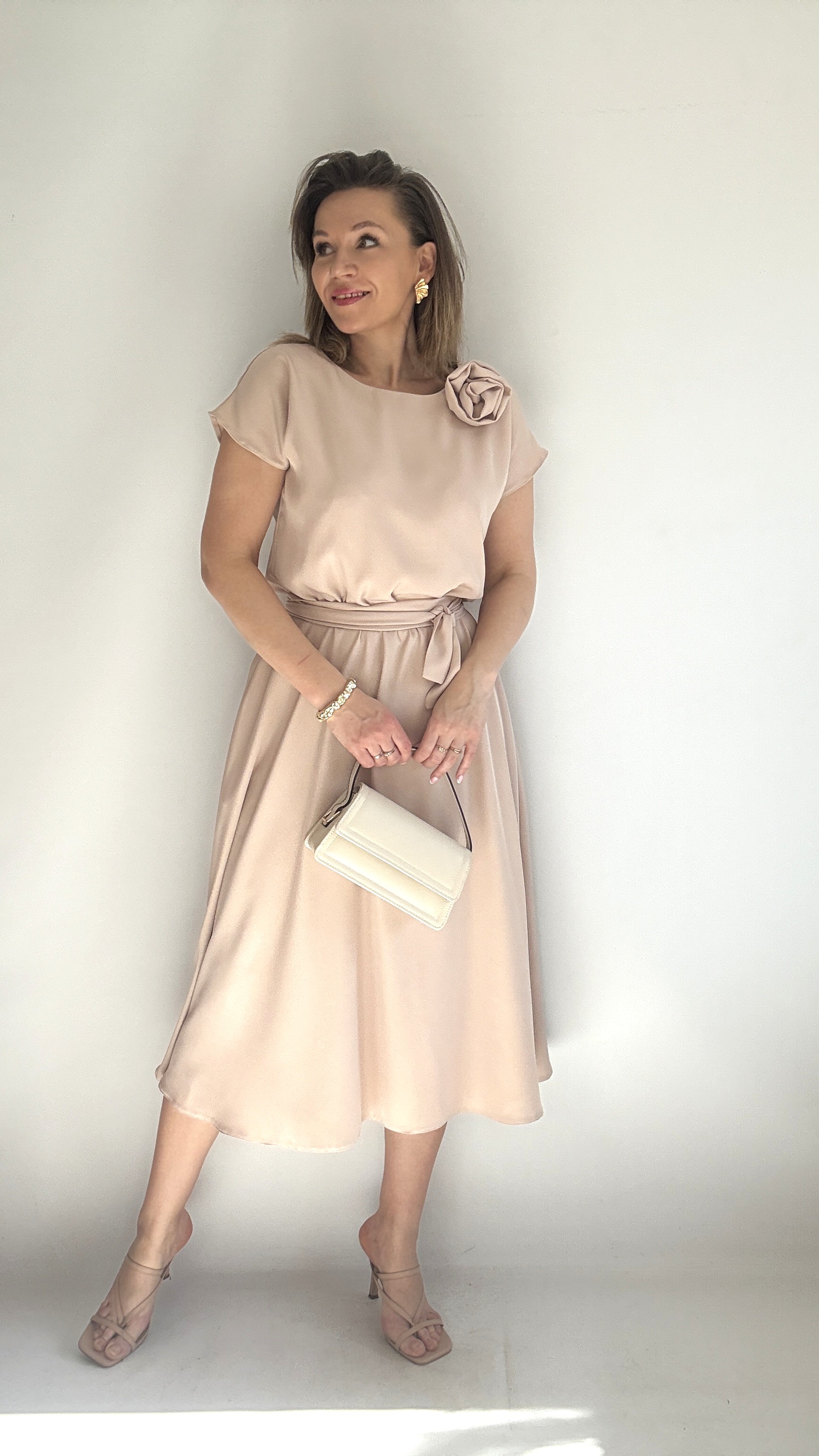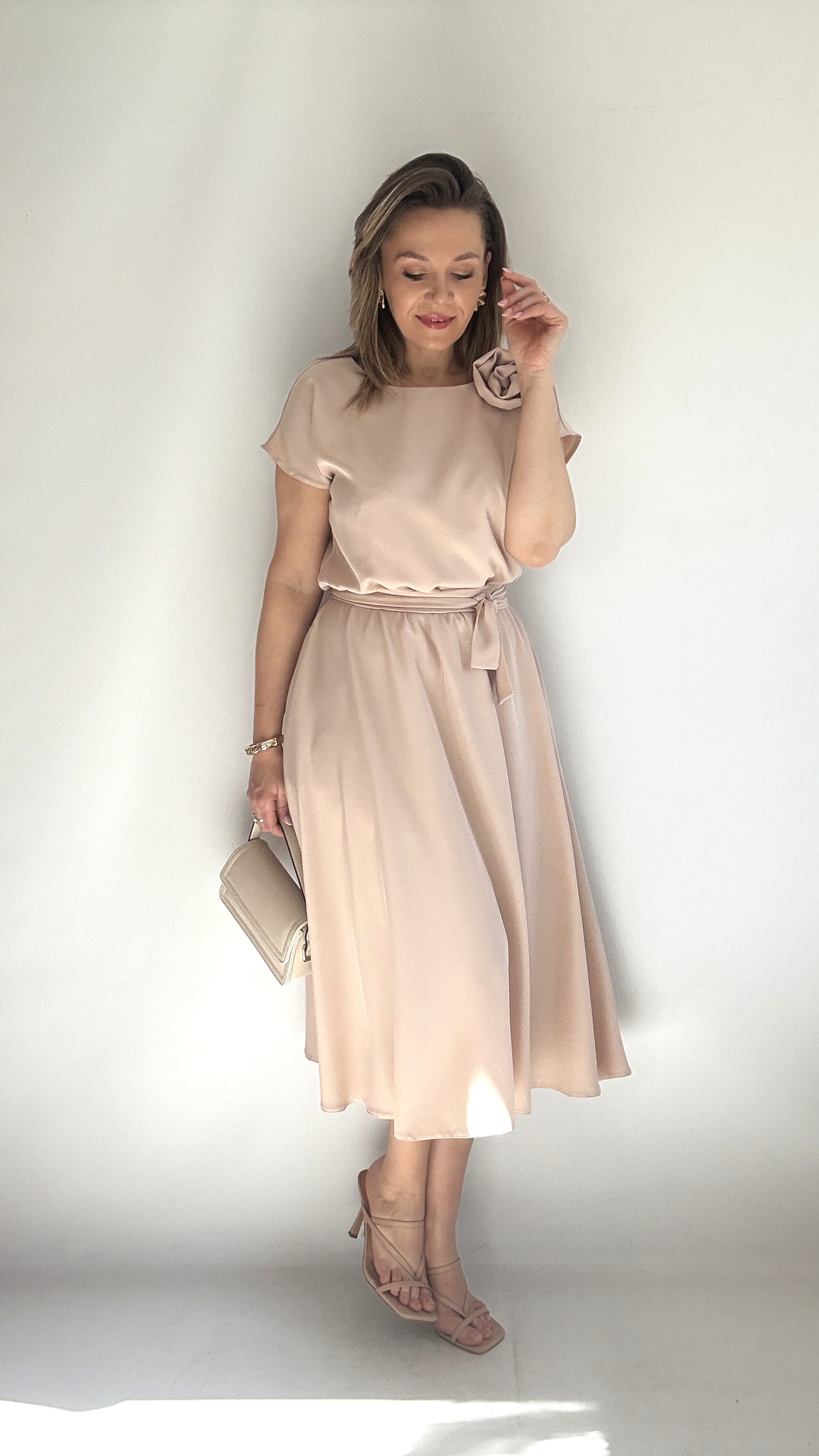 Rozkloszowana sukienka midi z różą beżowa
