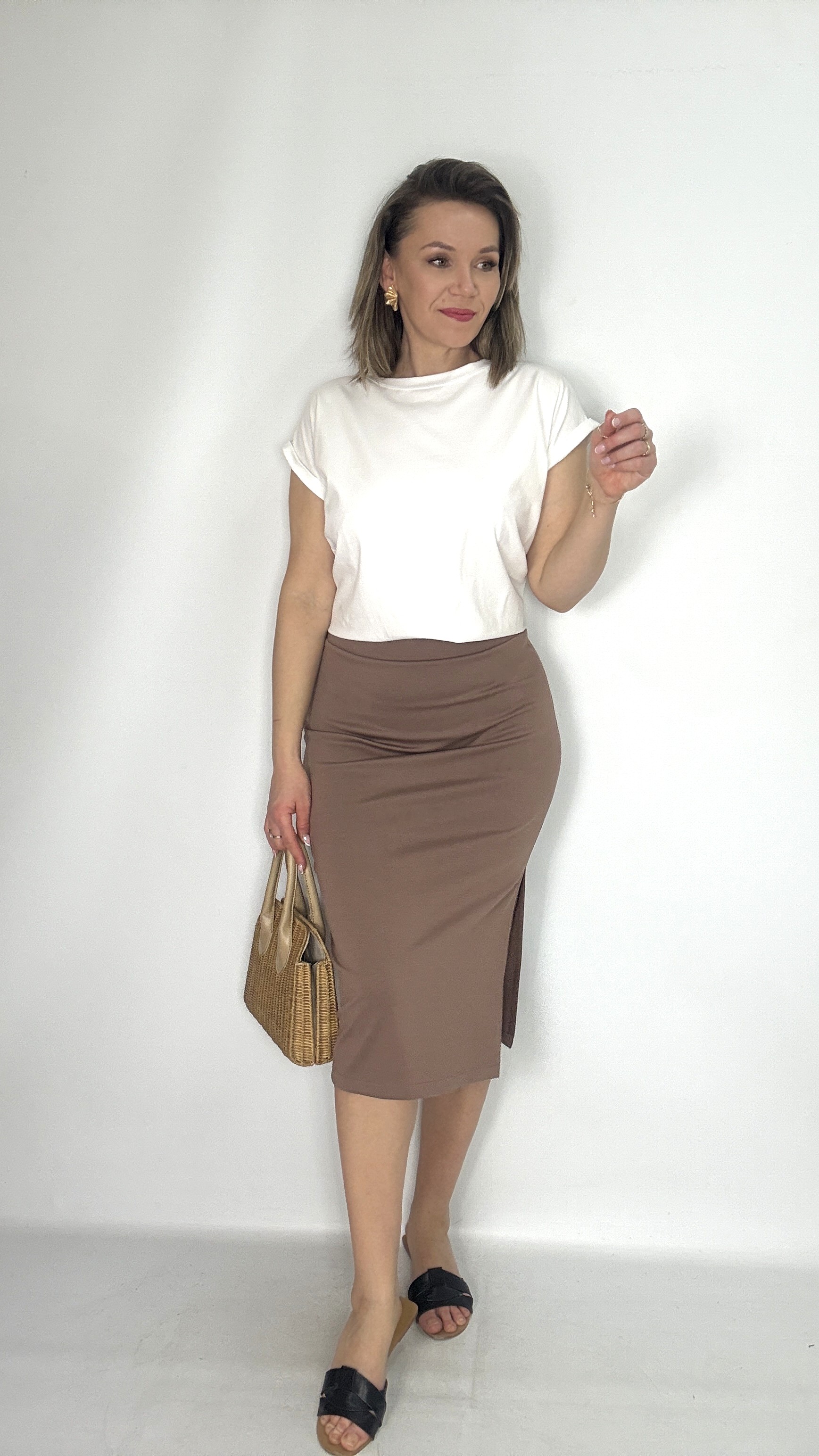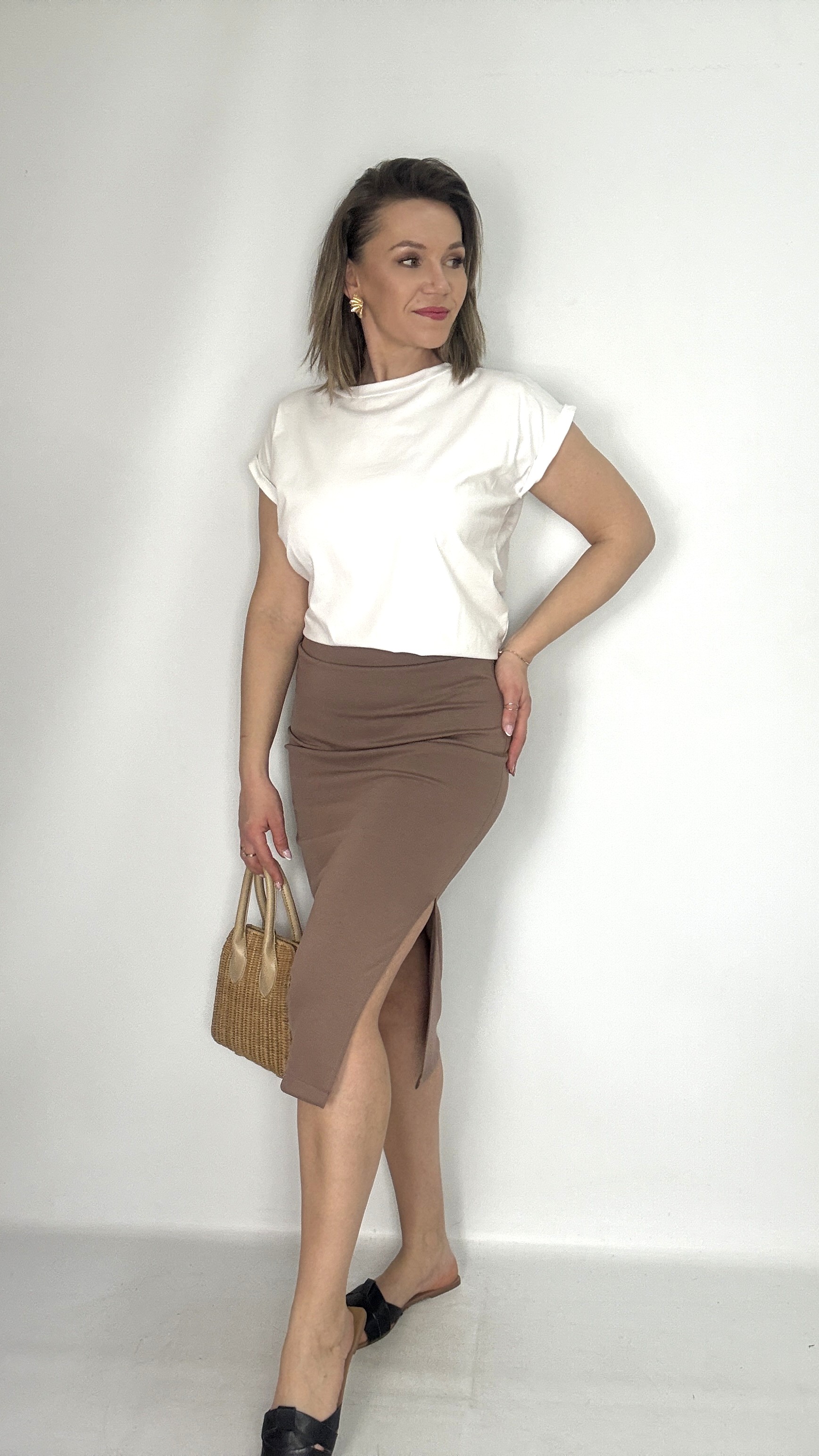 Spódnica ołówkowa dzianinowa z rozcięciem cappuccino